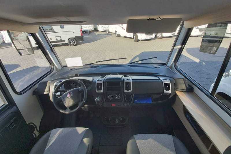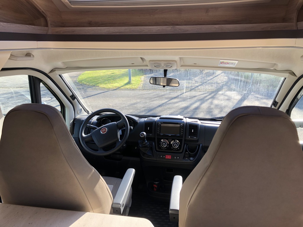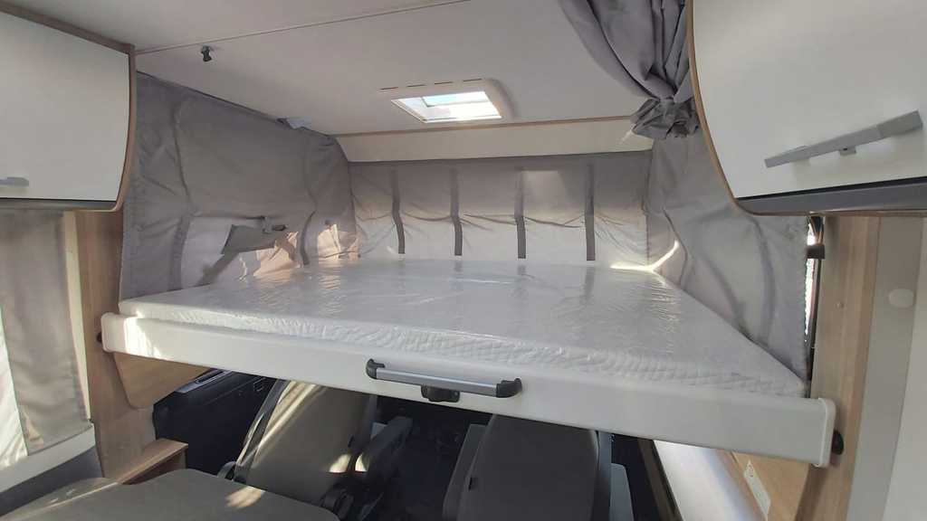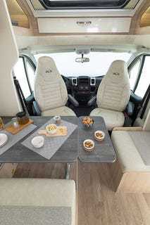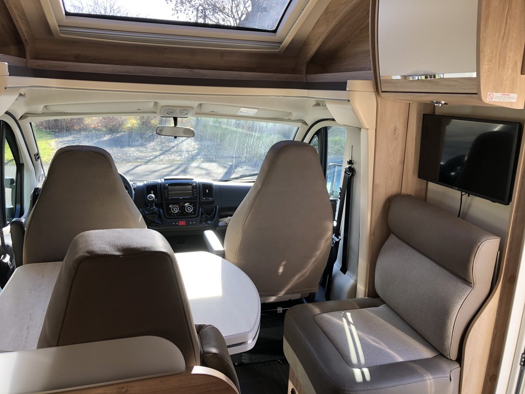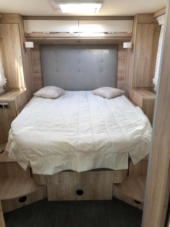 Im Innenraum des Wohnmobils beeindruckt das großzügige Raumgefühl, das vor allem durch das bündig in der Decke „versenkte“ Hubbett entsteht. Auch der Aufbau mit durchgehend isoliertem Leichtbaudoppelboden, holzfreien GFK-Wänden. Bodenfächern und einfach erreichbaren Serviceklappen lässt dabei keine Wünsche an eine angenehme Reise offen.