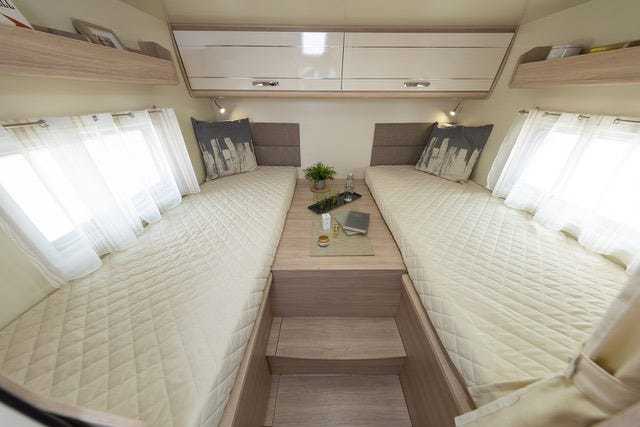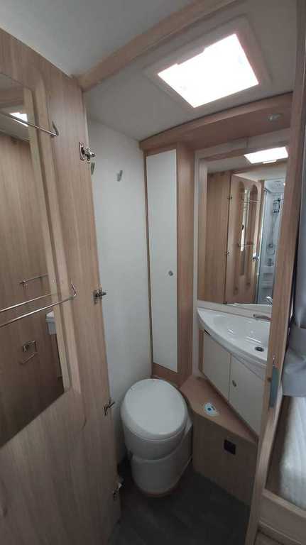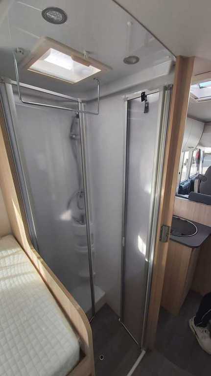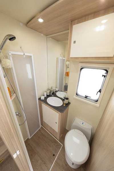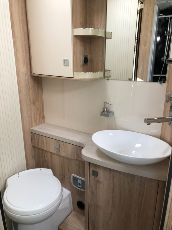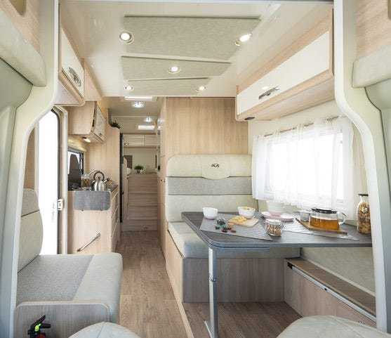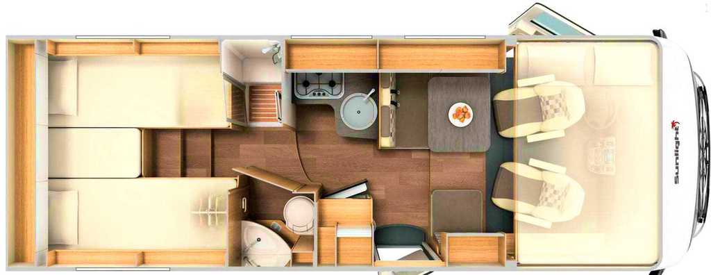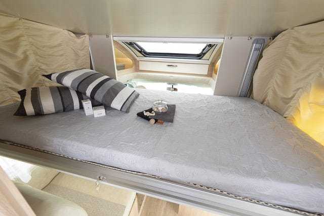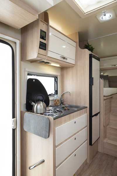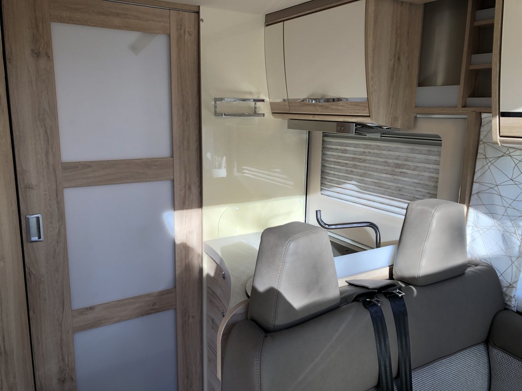 Im Innenraum des Wohnmobils beeindruckt das großzügige Raumgefühl, das vor allem durch das bündig in der Decke „versenkte“ Hubbett entsteht. Auch der Aufbau mit durchgehend isoliertem Leichtbaudoppelboden, holzfreien GFK-Wänden. Bodenfächern und einfach erreichbaren Serviceklappen lässt dabei keine Wünsche an eine angenehme Reise offen.