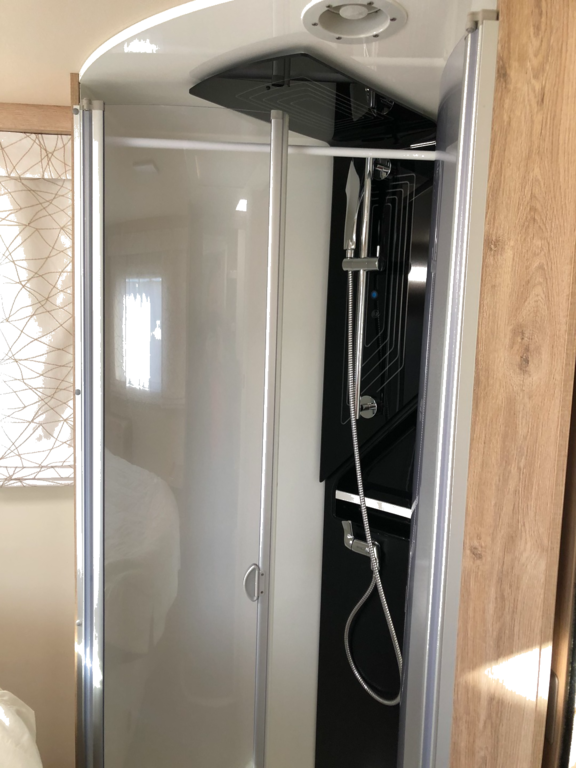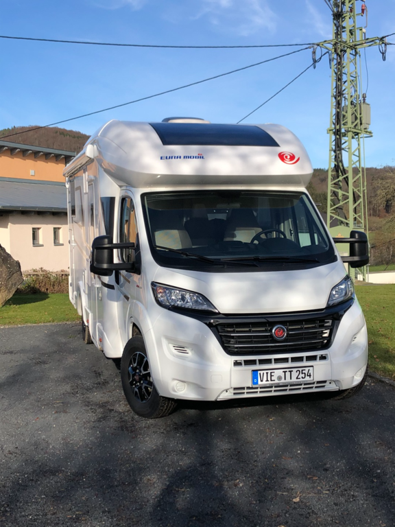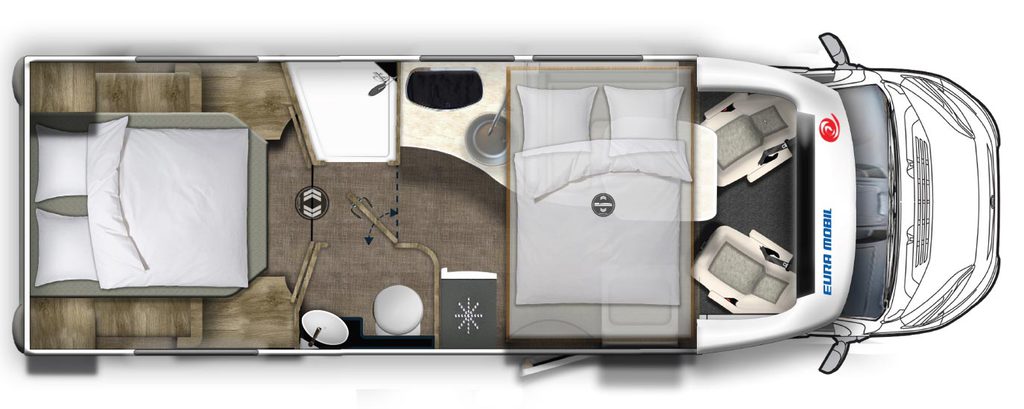 In der Küche herrscht durch eine indirekte Beleuchtung der Arbeitsplatte und der Spritzschutzscheibe nicht nur eine atmosphärisch angenehme Stimmung: die LED-Leiste unter der Arbeitsfläche leuchtet gleichzeitig auch die Küchenauszüge aus. Am Küchenunterschrank verzichtet Eura Mobil nun komplett auf Türen, sondern setzt ausschließlich die bequem von oben zu erreichenden großen Schubladen mit automatischem Einzug und Soft-Stop ein. Ein zweigeteiltes Schneidbrett dient gleichzeitig als Abdeckung des Spülbeckens. Im Waschraum kommen jetzt geschwungene Türfronten am Badschrank zum Einsatz, die Beleuchtung wurde ebenfalls optimiert und in der Dusche kommt eine hinterleuchtete Duschsäule mit gelaserter Grafik zum Einsatz, die selbst einen Wellness-Hotel gut zu Gesicht stünden. Auch im Schlafbereich zaubert die dimmbare Ambientebeleuchtung am Betthaupt mit Spiegel eine stimmungsvolle Atmosphäre. Die Garagenabsenkung mit isolierter Wanne vergrößert zudem das Stauvolumen unter den Betten. Die Lattenroste sind aufstellbar und bei den Zentralbetten zusätzlich verschiebbar. Im Heckbereich ist auch der USB-Port für die Ladung von Mobilgeräten angebracht. In den Aufbaufenstern kommen jetzt geräuschgedämmte Fensterrollos zum Einsatz (Seitz-Komfort-Rollo). Ein neuer, eleganter Fußbodenbelag in moderner Holzoptik wurde passend zu den alternativ erhältlichen Wohnwelten „Chalet“ und „Navarra“ ausgesucht.